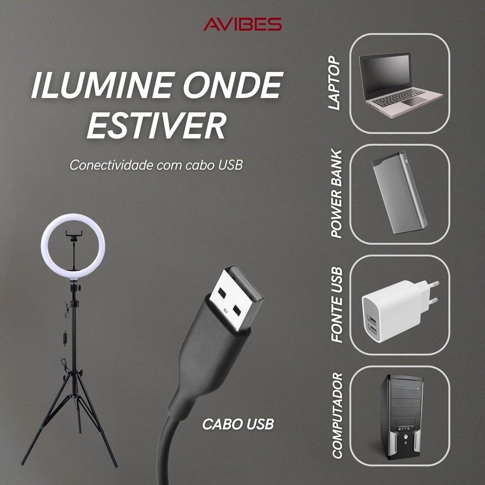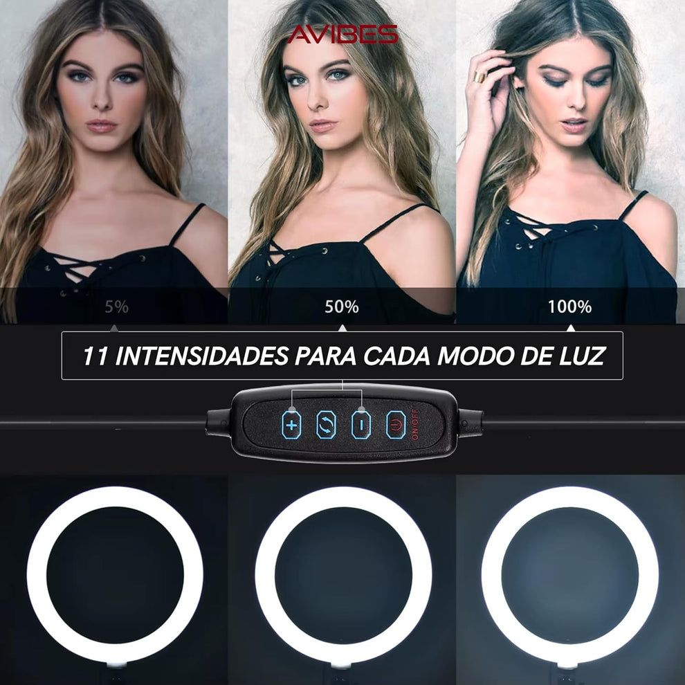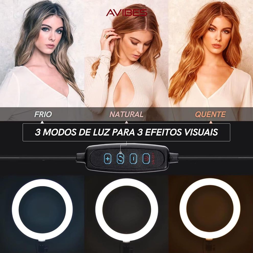 Kit de Iluminação de Anel LED, Ring Light, Com Tripé de 2,1 m, 3 Tonalidades de Luz, AVIBES