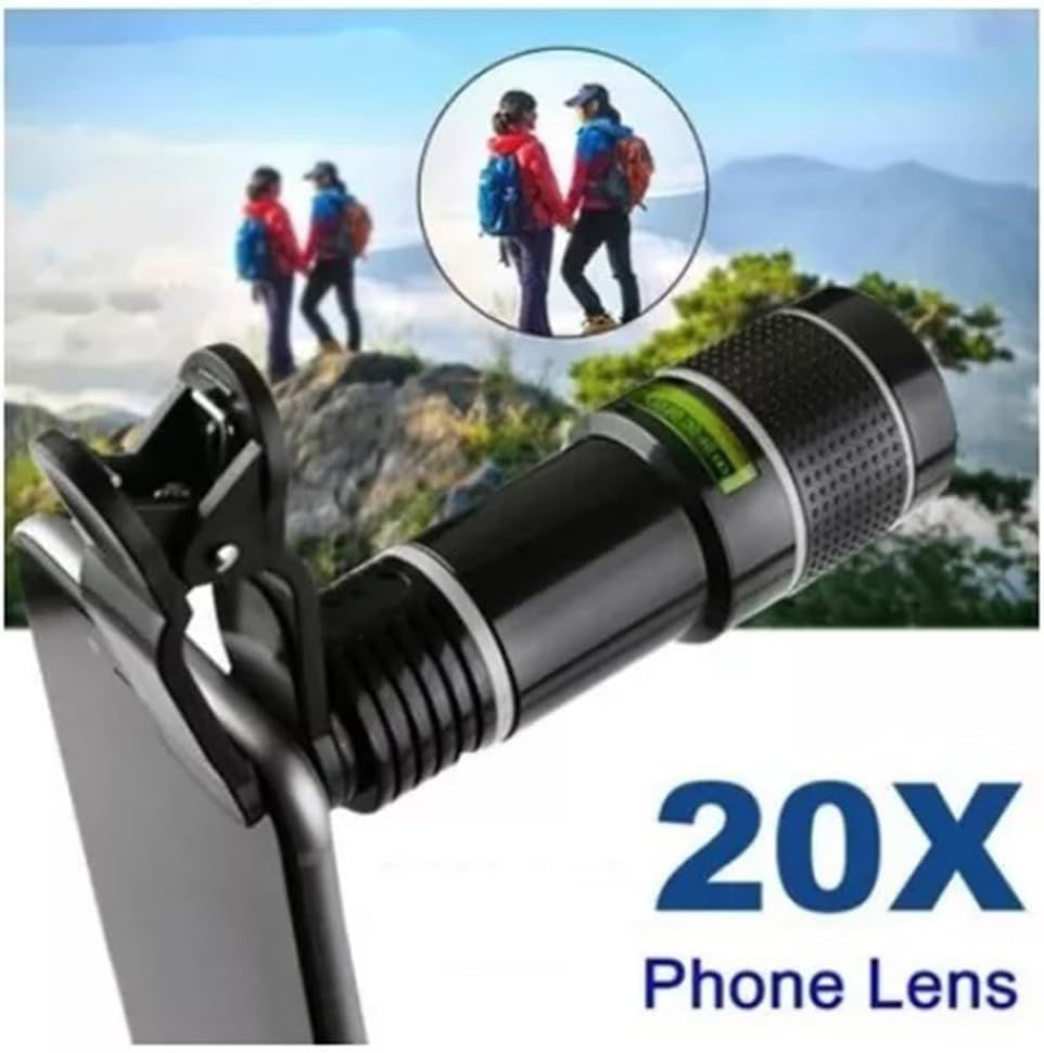 LENTE TELESCÓPICA: Este acessório para celular é uma lente telescópica com zoom de 20x, perfeita para capturar imagens nítidas e detalhadas à distância.