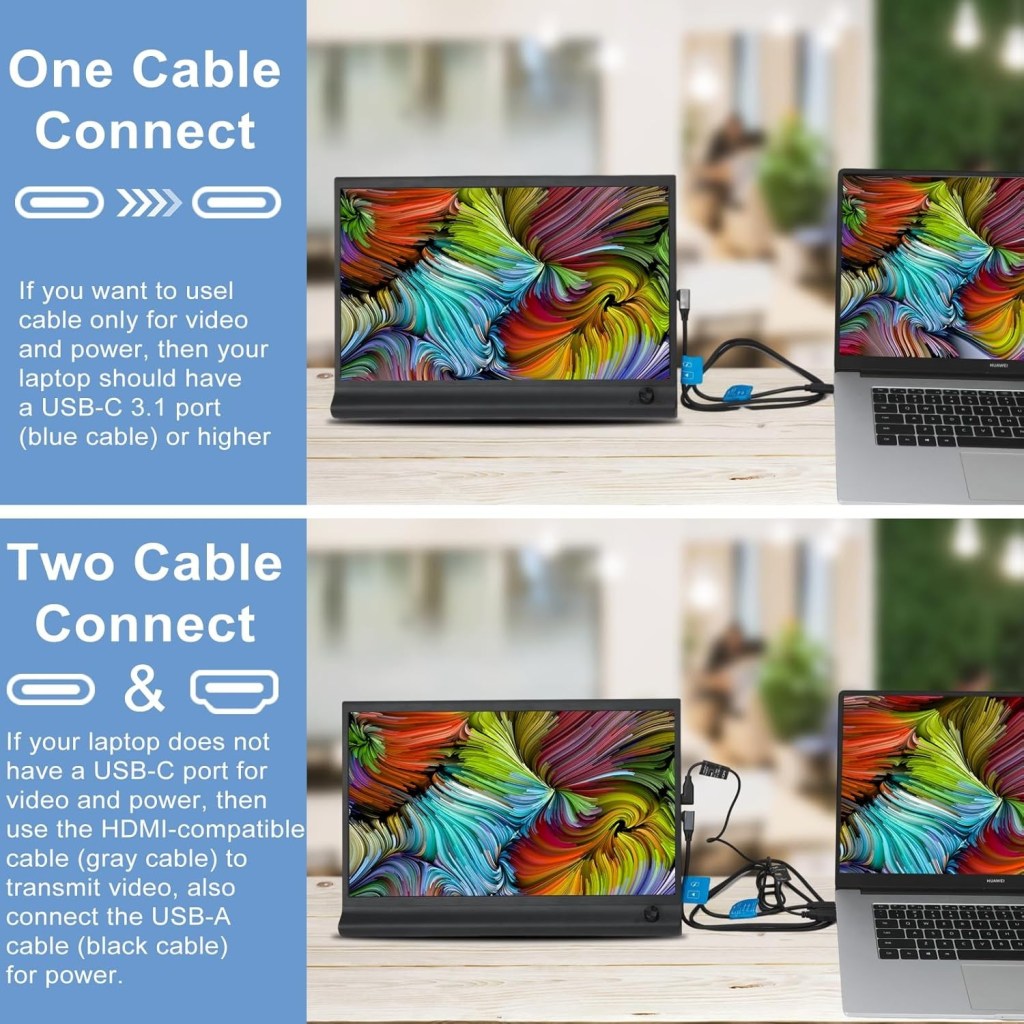 - 【Laptop Monitor Extender】15.6-inch ultra-portable display, 1920*1080 HD/FHD/IPS input, 60Hz high resolution, adjustable brightness. Weighing only 820 grams, this portable display is easy to carry and operate. Standalone operation, plug and play.