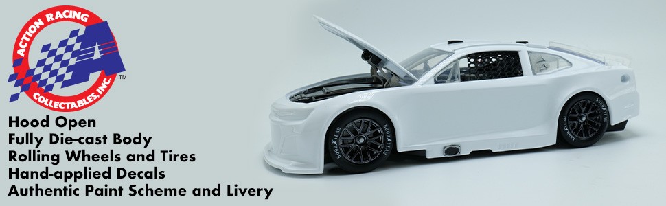- FEATURES: Officially licensed by NASCAR / Full die-cast body / Plastic Chassis / Opening hood / Opening roof flaps / Manufacturer-specific engine detail / Manufacturer-specific body contour / Rolling rubber tires / Front wheel steering / Driver side window net / Working suspension / Authentic paint scheme decoration / Interior dash detail