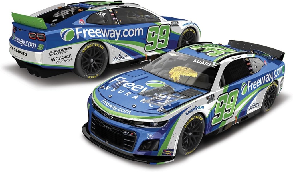 - SPECIFICATIONS: Racing Series: NASCAR Cup Series / Driver: Daniel Suarez / Car No.: 99 / Sponsor: Freeway Insurance / Team: Trackhouse Racing / Car Make: Chevrolet / Car Model: Camaro / Scale: 1:24 / Finish: Standard – Race Win / Type: ARC / Mold: Hood Open