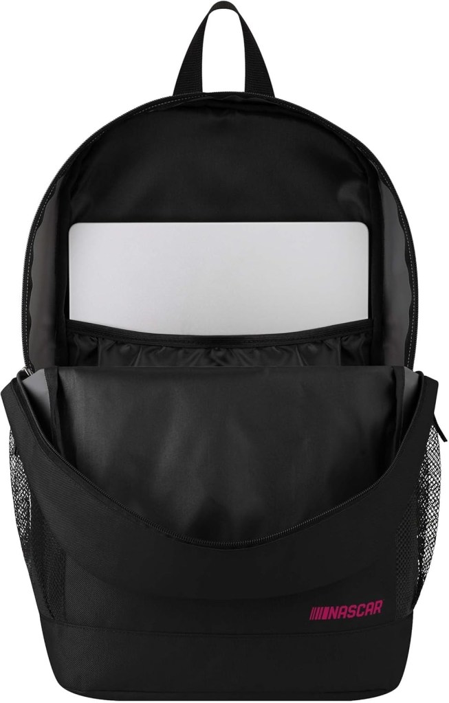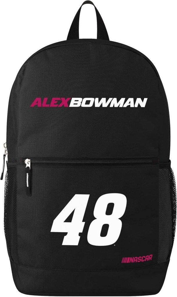 - Bold Name and Number Display: This backpack features driver logos on the front