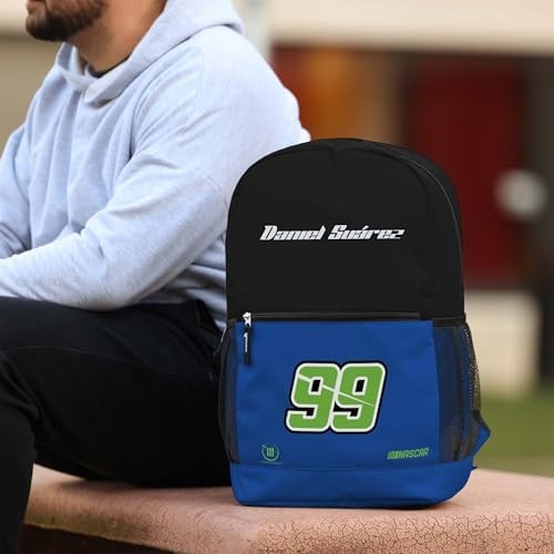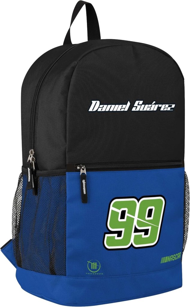 - Bold Name and Number Display: This backpack features driver logos on the front